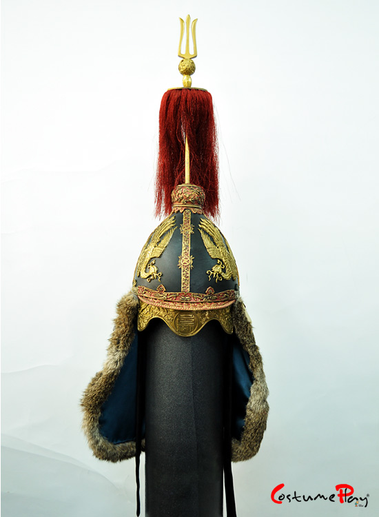 투구를 보시면, 투구 양쪽에 섬세하게 조각된 황금색 봉황 문양을 확인하실 수 있습니다.