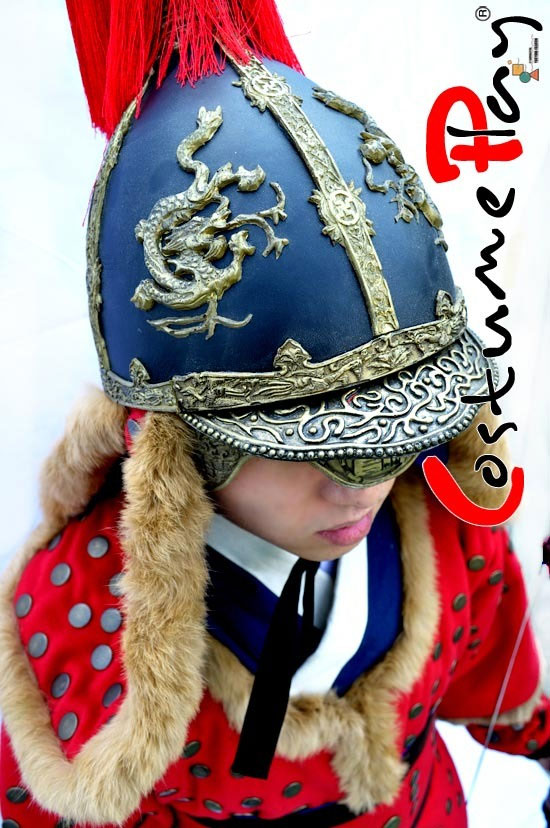 투구 상단에 달린 풍성한 붉은색 털 장식은 실제 조선시대 투구의 특징을 잘 보여줍니다.